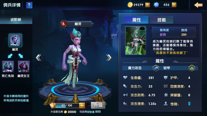 《军团对决》中的英雄角色和法术卡牌多达百张以上,分为普通、稀有、史诗、传奇四种品质,首发登录即送的幽灵就属于史诗品质,她拥有死亡先知和幽灵女王两种进阶路线可以选择,是一个非常强大的后排魔法输出。