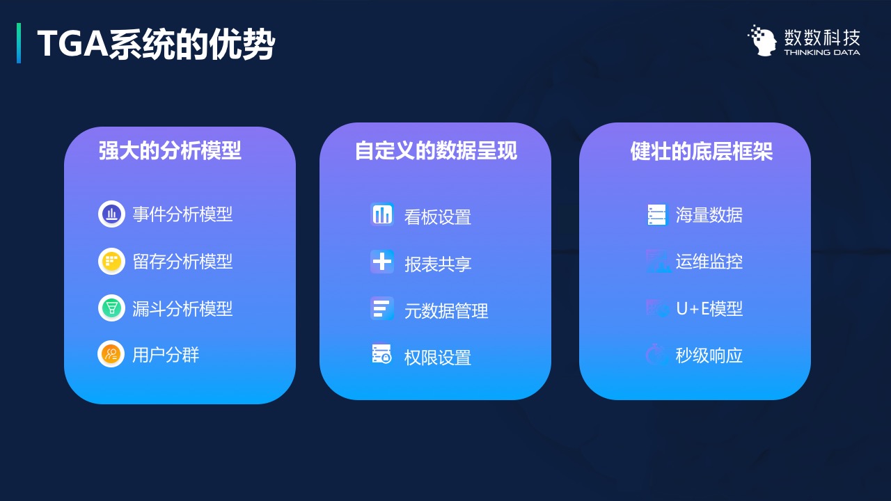 据数数科技介绍,TGA系统通过底层框架和存储技术的创新,突破了传统大数据分析系统的不足,系统目前的数据处理效率达到了每天100亿的事件量,并支持全端数据采集、兼容历史数据。能帮助用户实现实时的数据分析与问题诊断。