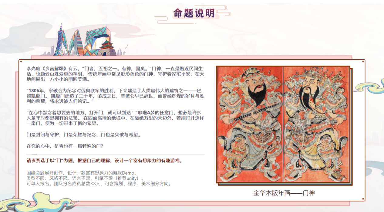 今年的赛事命题更深层次地融合了优秀的传统文化和工艺,本次网易游戏学院与谷雨中国联合命题,共同探索传统文化与游戏的融合及呈现,并联合邀请中国出版协会年画艺委会副主任、浙江木版年画省级非物质文化遗产代表性传承人黄菁菁,为赛事提供木板年画参考。