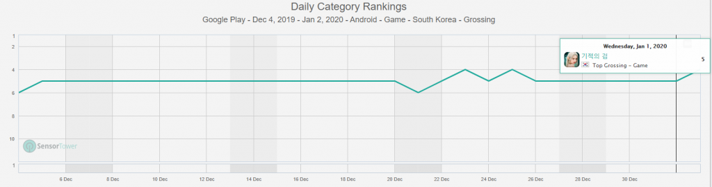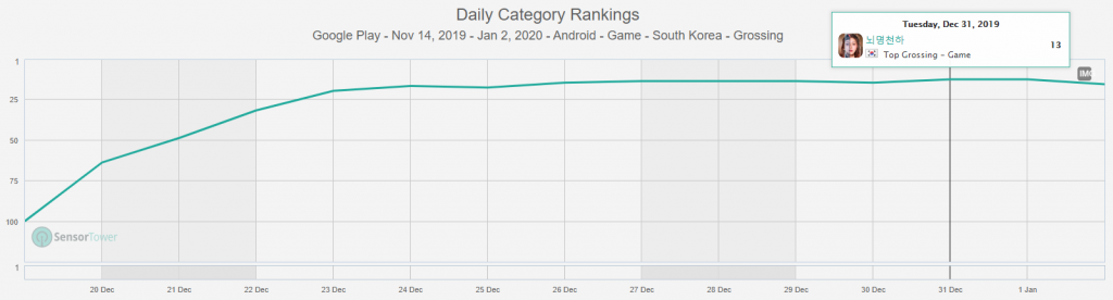 游戏上线之后的表现就一如《奇迹之剑》当时登陆韩国市场一样:在上线首周就顺利打入免费榜头部,并且迅速杀入畅销榜TOP20,之后更是一直稳守在TOP15之内,在19年的最后一天,以及20年的第一天,游戏更是斩获并稳住了上线后的最佳成绩:畅销榜第13位。