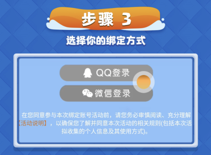 活动公告针对此前非微信或QQ登录的玩家,简单说就是让原本分散的渠道账号统一绑定成微信或QQ登录。只需登录原游戏账号,在游戏内点击绑定活动弹窗进入绑定指引,再根据是选择QQ还是选择微信渠道绑定就可以了。需要注意的是每个账号只能绑定一个微信或一个QQ,务必看清楚平台再进行操作绑定。