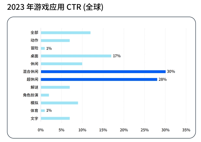 ● 混合休闲游戏正在蓬勃发展,月活用户 (MAU) 平均收入比超休闲游戏高出800%,这主要得益于变现元素在游戏中的应用。此外,该类别的点击率同样超过超休闲游戏,达到了30%,位列游戏子类别之首。