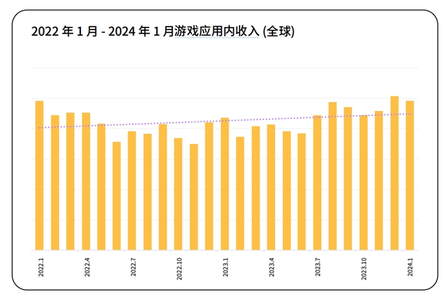 ● 游戏应用内收入一路攀升,2023年同比增幅达6%,12月比当年平均值高出17%,同比提升21%。这一强劲的增长趋势也在2024年得到延续,1月应用内收入同比增幅达到13%。
