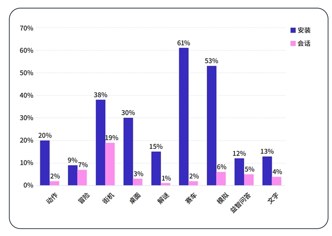 ● 竞速和模拟类游戏表现突出,安装量年同比增幅分别为61%和53%。街机游戏紧随其后,安装量和会话量分别增长38%和19%。