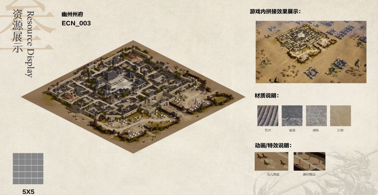 另一边,幽州则位于中国北方,气候相对干旱,植被稀疏;并且根据历史记载,幽州的城池自古都是兵家必争之地,兼备大型战略中枢的作用。所以在外形设计上,会以黄沙土地为主,辅以许多兵营、马场、营造等战争建筑,突出萧瑟、肃杀的氛围感。