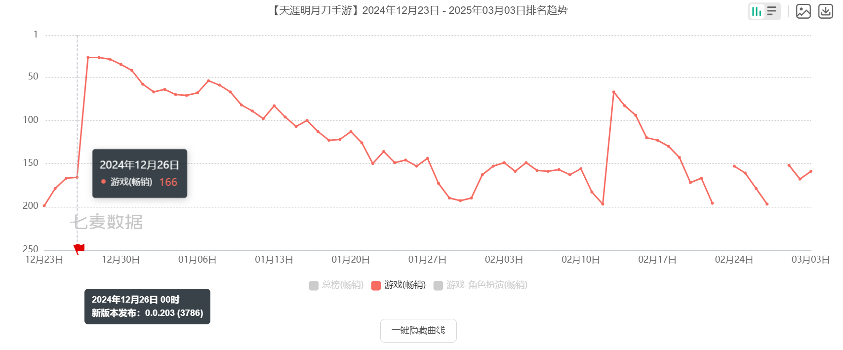 但是从最终结果来看,《天刀》的探索并不成功,在《天刀》手游近一年的iOS畅销排名数据当中,最高也只短暂地来到了游戏畅销榜第27的位置,相比于《天刀》手游早期的成绩来说,还是存在着一定的下滑。结合前文提到的失败项目《Glow》来看,杨峰在北极光的职业生涯后期遇到的问题确实不小,离职时也只能说是有功有过。