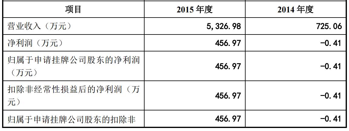 根据公开转让书显示,掌握时代2014年度、2015年1-12月营业收入分别为725.06万元、5326.98万元,净利润分别为-4057.81元、456.97万元。