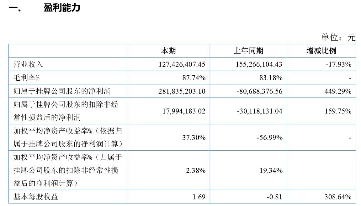 9月14日,墨麟股份发布2016年上半年财报(由于上周并没有报道,所以特此补充),公司完成营业收入1.27亿元,同比减少17.93%;实现归属于挂牌公司股东的净利润2.81亿元,同比增长449.29%;基本每股收益1.69元,同比上升308.64%。