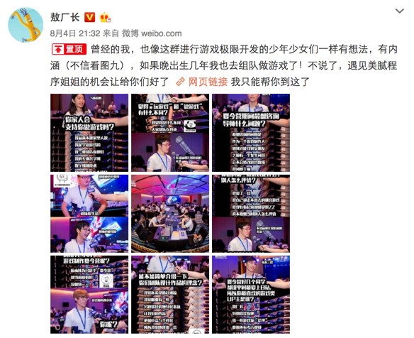 近日,游戏圈最高人气的UP主敖厂长微博发布了一组图片,盛赞参与极限游戏开发的少年们:“有想法、有内涵“,还表示自己”生不逢时”。