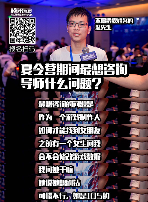 当然也有调皮的学霸。活动给选手们提供了咨询导师的机会,小伙伴们都在踊跃地问技术和理念,不会IOS刷钻的温先生却想问导师“如何找到女朋友”。导师只能表示,这个问题,我也帮不了你……