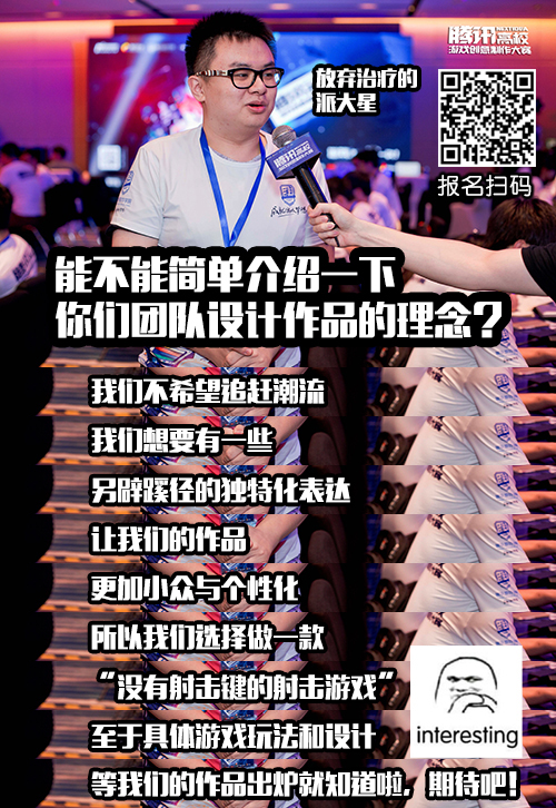派大星同学从法国留学不远万里回到中国参加这次夏令营,谈到团队的设计理念,他透露说要做一款“没有射击键的射击游戏”。还有这样的操作?只能说这个理念,很优秀!