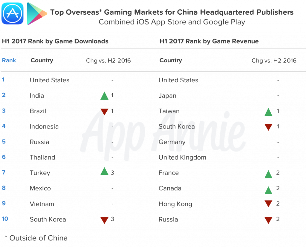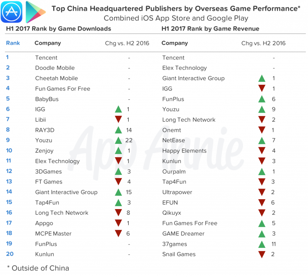 在2017年上半年的海外市场,智明星通和IGG依旧表现稳定。游族的策略手游《狂暴之翼》(Legacy of Discord)表现抢眼,拿下了32个国家的AppStore综合畅销榜榜首。与2016年上半年相比,游族的海外下载量上升了22个名次,而海外营收则上升了9个名次。游族的成功也意味着中国手游发行商有实力与国际巨头一较高下。