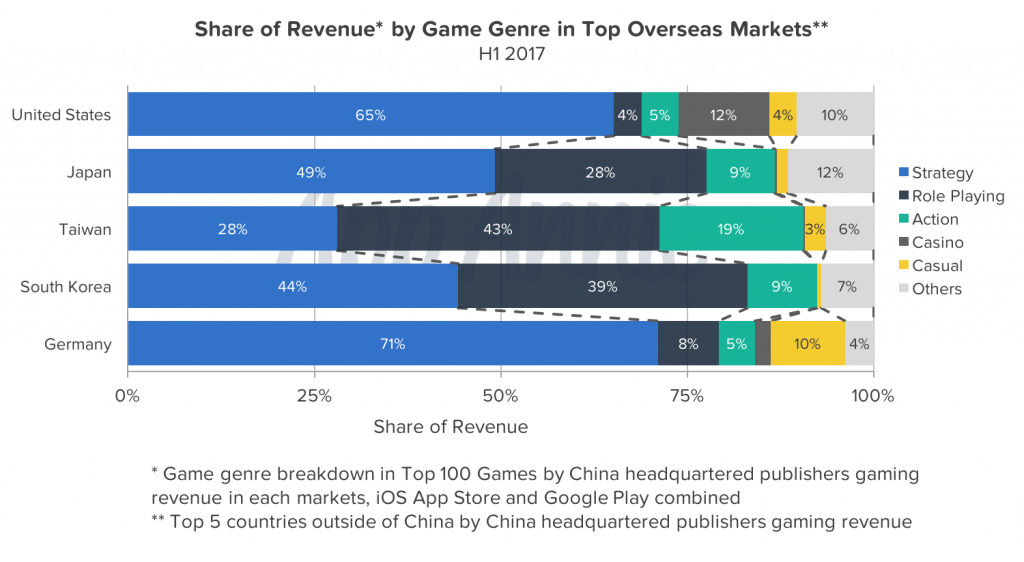 在不同的国家,中国手游发行商推出的游戏类型也不同。例如,在德国和美国,《Castle Clash》和《王国纪元》这样的战略游戏占据了一半以上的收入份额。而在日本、韩国和其他东亚市场,RPG品类的《MUOrigin》和《阴阳师》占据了重要份额。