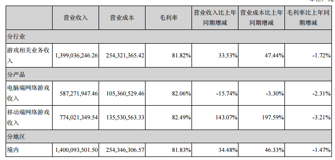 报告显示,巨人网络2017上半年游戏相关业务共收入约13.99亿元,同比增长33.53%;营业成本约2.54亿元,同比增长47.44%。其中端游收入5.87亿元,同比减少15.74%;移动游戏收入7.74亿元,比上年同期增加143.07%,占总营收的55.17%,收入增长主要系《球球大作战》和《街篮》等新游戏收入上升,移动端网络游戏营业成本比上年同期增加197.59%,主要系移动端收入增加,导致版权方分成费增加,同时由于手游人数增加服务器托管费较上年同期增加。