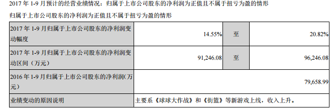 报告表示,巨人网络预计在2017年1-9月实现净利润9.12亿元—9.62亿元,同比增幅在14.55%-20.82%之间。