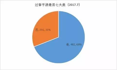 7月获得版号的手游中,七大类产品482款,占比69%,较之前两个月有较大幅度增长。非七大类产品216款,占比31%。