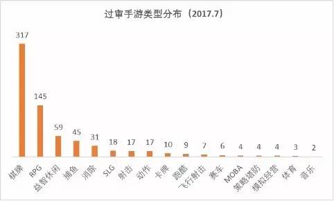 游戏类型方面,继6月份棋牌游戏数量大增之后,7月份该类型产品数量依旧居高不下,是排在第2位的RPG游戏的两倍之多,且从占比来看,比6月份更高。TOP4类型维持不变,依旧是棋牌、RPG、益智休闲和捕鱼。消除类手游7月数量大涨,超过SLG居于第5位,除此之外,其余长尾类型变化不大。