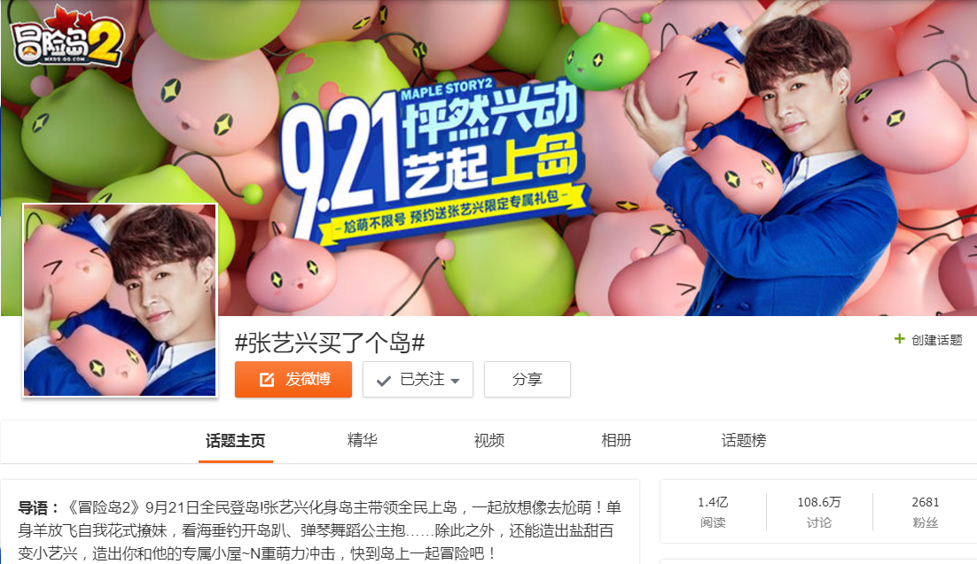 而随着游戏不限号开启临近,粉丝的热情也日益高涨。根据话题“张艺兴买了个岛”,以及公开海报中张艺兴抱着萌物的“甜萌”形象,粉丝们的脑洞YY更是停不下来:与张艺兴经营农场,被张艺兴公主抱等等憧憬持续刷屏。