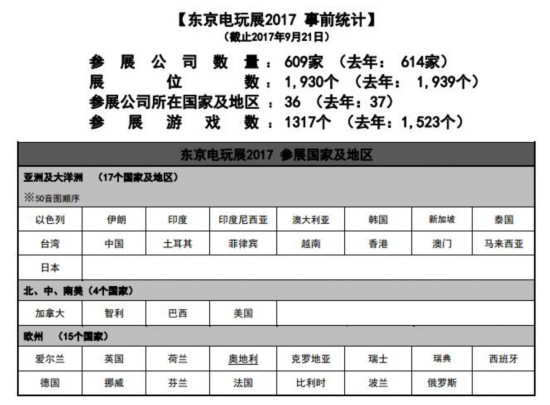 根据CESA的官方数据统计,截止至9月21日开幕日当天,有来自36个国家及地区的609家企业及团体参加了TGS2017,其中,日本国内公司为292家,海外公司为317家。(去年日本国内269家/海外345家),今年的日本国内参展公司数量创下历史新高,而海外参展公司数量也继续保持过半数的水平,标志着东京电玩展已成为了亚洲地区业务洽谈的枢纽。