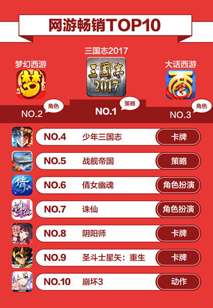 除了《三国志2017》外,畅销榜上其他的游戏,都是一些熟悉的面孔。《梦幻西游》、《大话西游》、《阴阳师》和《倩女幽魂》组成的网易系地位仍旧稳固,《圣斗士星矢:重生》、《崩坏3》和《少年三国志》等游戏,也都是畅销榜上的常客。随着策略类游戏的崛起,动作类在榜单上的生存空间正在逐渐被挤压,角色扮演、策略和卡牌则形成了新的“三足鼎立”之势。