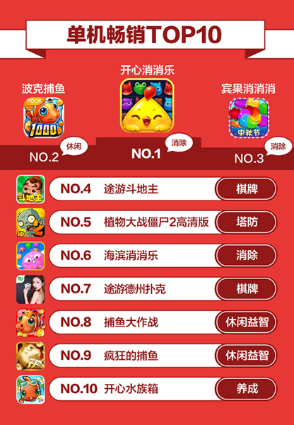 与网游畅销榜中颠覆性的变化不同,单机畅销榜则略显沉寂,与8月份的榜单相比,甚至连榜单中的游戏都没有发生太大的变化,只是在名次上有了一些出入。《开心消消乐》、《波克捕鱼》和《宾果消消消》组成的前三甲相当稳固,消除、棋牌和休闲益智的“三国争霸”目前看来短时间内也不太会产生大的变动。随着Q4的到来,各大厂商开始纷纷发力,单机领域出现新品破局的可能性同样存在。