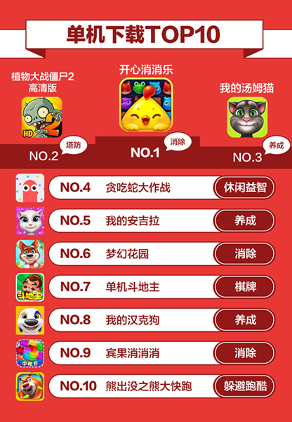 单机下载榜的和单机畅销榜的变化如出一辙,基本上都没有大的变化,《我的汤姆猫》、《开心消消乐》、《我的安吉拉》等面孔都是榜上的常客。养成类和消除类依旧是最受欢迎的单机游戏类型。其余的则被休闲、棋牌、跑酷和塔防所瓜分。榜单中唯一的新面孔,是由乐逗游戏发行的《梦幻花园》,这款由海外引进的消除大作,在传统的消除玩法上,融合了养成、模拟经营等玩法,是一款相当有新意的新游。