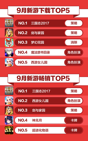 在9月新游的竞争中,《剑与家园》和《三国志2017》成为了最大的赢家,两款同为SLG类型的游戏,在同一时间内都获得了成功,不得不让人称奇。遍观9月新游榜单,角色扮演类、卡牌类、策略类的游戏还是占据着市场的主体地位,厂商在类型选择上,仍然偏向于选择这些较为稳妥的游戏类型,但游戏题材、类型和玩法方面的变化,已经潜移默化的产生了。