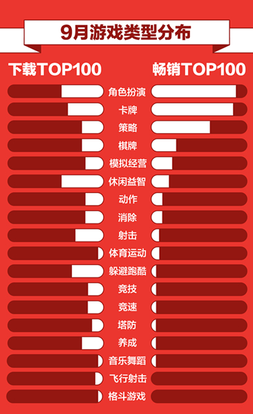 9月份游戏类型分布方面,角色扮演、卡牌和策略三种传统游戏类型仍旧维持在第一集团。但第二集团目前来看还处于一片混战,除去休闲益智类在下载类的天生优势外,其他类型的游戏数据都相差无几。目前看来游戏厂商们也不在局限于单一领域的产品开发,而是努力进行着全领域的覆盖计划。模拟经营、体育、休闲竞技、载具射击、放置、跑酷、塔防、三消等各个领域都有产品推出,相信可以满足玩家对游戏类型的需求。