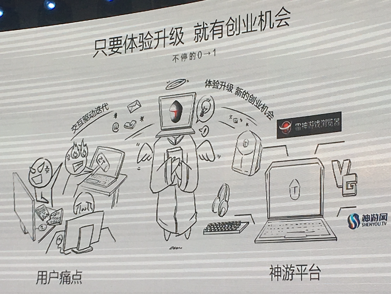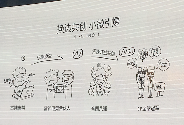 路凯林表示雷神科技的品牌使命是让每一位玩家都能拥有提亚极致的游戏体验。路凯林用三幅漫画简单讲述了雷神科技是如何从做游戏硬件到做游戏玩家一站式服务共创平台的。
