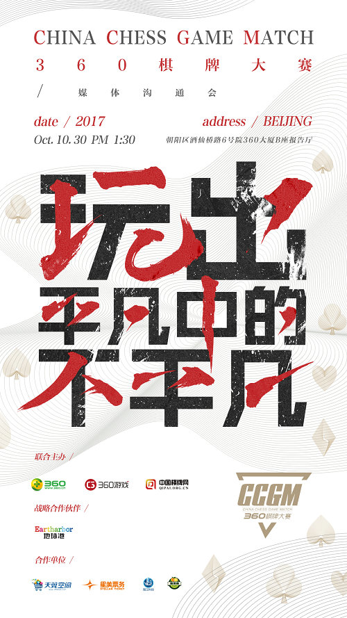 2017年10月30日,首届360棋牌大赛新闻发布会在北京360总部举行。360棋牌大赛是奇虎360、中国棋牌网联合举办的全国性赛事活动。大赛联合多家知名棋牌类游戏品牌,本着公平、公正、公开的原则,旨在倡导公平竞技,推动健康游戏,弘扬棋牌文化。奖金池高达百万元,是360公司布局棋牌竞技领域的重磅之作。