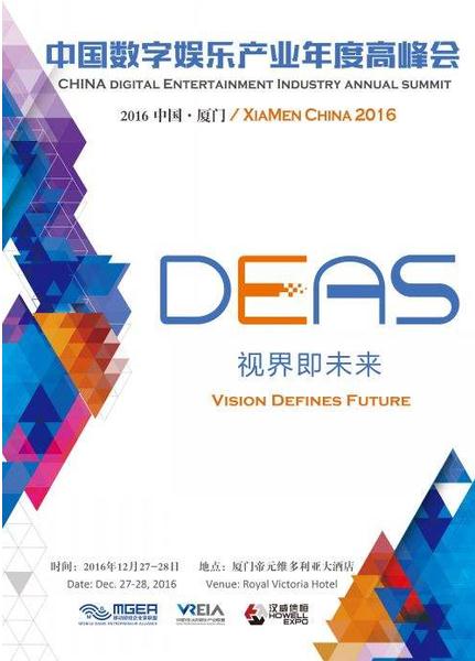 2016年,移动游戏产业年度高峰会(MGAS)改名为中国数字娱乐产业年度高峰会(DEAS)。而与往届最为不同的,不仅是峰会名称的更新,本届峰会加入了诸多全新热点内容,对IP手游、VR和AR技术发展的探讨,全面呈现。而本届峰会的主题“视界即未来”,则通过四个方面详细阐释了这一主题的核心内容。