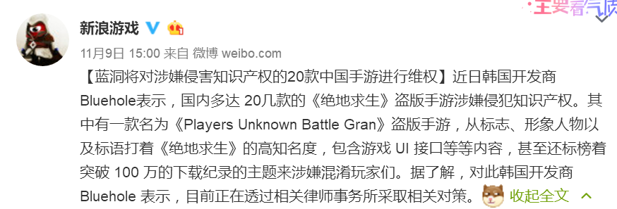 蓝洞对此表示,目前正在透过相关律师事务所采取相关对策,面对中国盗版手游意图利用市场,来涉嫌侵害《绝地求生》知识产权,公司将会采用法律手段来维护权益。