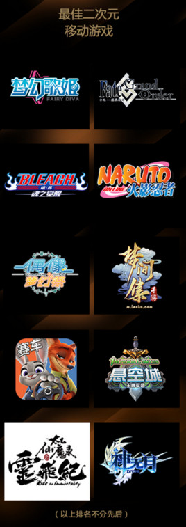 在该类别的上榜游戏中,我们能看到不少熟悉的面孔,除了今年依托自有动漫IP大热的《Fate/GrandOrder》、《BLEACH境·界-魂之觉醒》和《火影忍者》外,像《梦幻歌姬》、《偶像梦幻祭》这样主打优美音乐与激萌人设的游戏也成为了该奖项的座上宾,而像《梦间集》、《神无月》这样表现优异的国产二次元手游更是大有赶超“热门IP”之势。