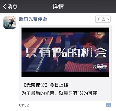 在长达一个月的预热之后,腾讯在《光荣使命》上线当天的推广投入也毫不吝啬,上线当天除了有朋友圈广告覆盖、微信手Q应用宝三大渠道力推之外,还推出了“光荣之日”的活动,大手笔邀请了上百位游戏主播,包括PDD、五五开、若风、Miss、小苍、大司马、骚男等等,开启跨平台同步直播,百位主播以四人小组为单位,在游戏中进行对战。为了这款游戏的市场热度,腾讯可谓是卯足了劲。