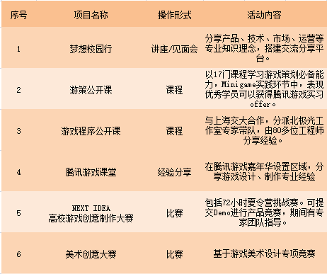 比如,在“梦想校园行”中,在校学生可以通过讲座、见面会接触到腾讯旗下产品、技术、市场、运营等专业知识理念,近距离了解从游戏立项到上线运营的相关程序。“游策公开课”项目中,首先在北京、上海、广州、武汉四座一线城市,通过四大腾讯旗下自研工作室群游戏专家走到高校进行线下授课,进行成体系的游戏策划、游戏程序、文学策划及运营知识分享。