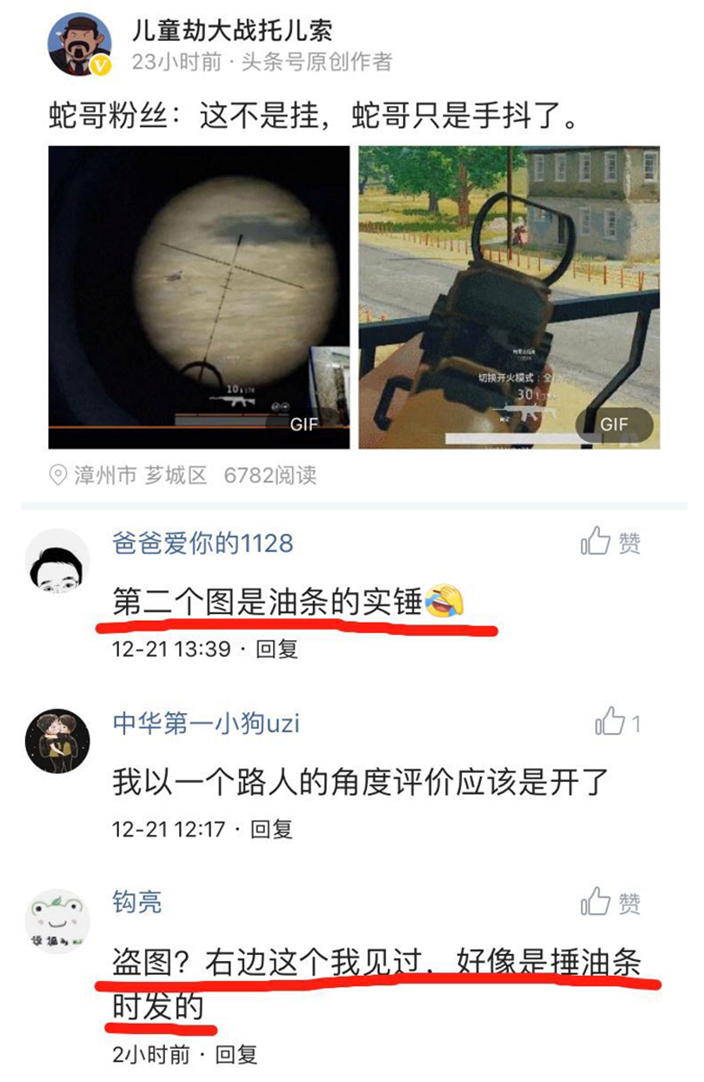 而这也给了一些在背后想要搞事的人机会。比如头条上一个名叫“儿童劫大战托儿索”的头条号作者发布了一个讽刺蛇哥及其粉丝的实锤GIF图,但其实被网友发现这个图其实是之前锤油条开挂时发过的。也就是说,有人在故意给蛇哥泼脏水,已达到某种目的。
