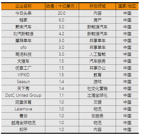 中国“独角兽”多领域遍地开花