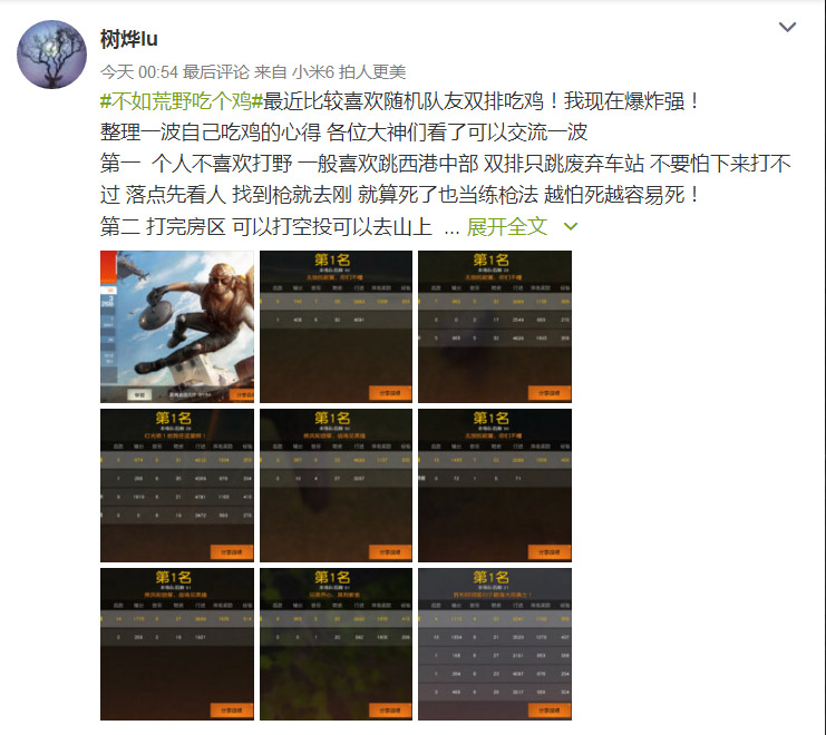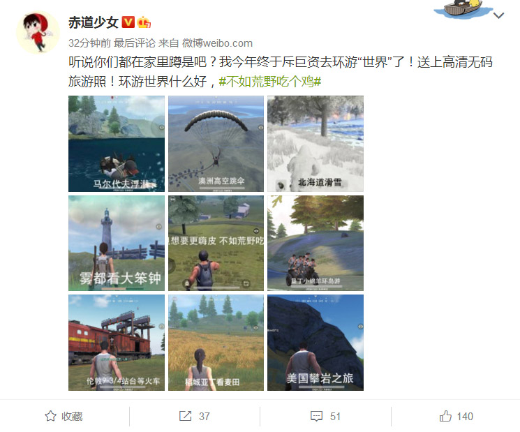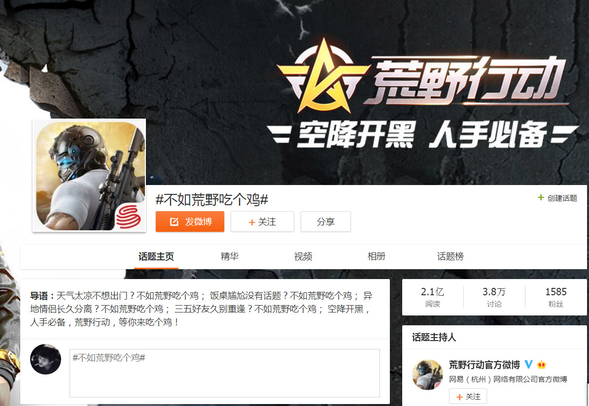 这里说的社交是一种广义上的社交,例如玩家在游戏中的组队、对抗,游戏外的晒图、晒成绩、甚至自嘲晒失误等等,本质上都属于面向群体的交互行为。《荒野行动》能够多次在社交媒体引发讨论热潮,与它庞大的玩家基数有着不可分割的关系。舞台越大,演员展示时热情越高涨,表现欲也会更加强烈,这一心理放在游戏领域也照样通用。同时由于《荒野行动》的竞技本质,也使得玩家的展示内容充满积极性,更容易引发“跟风”。