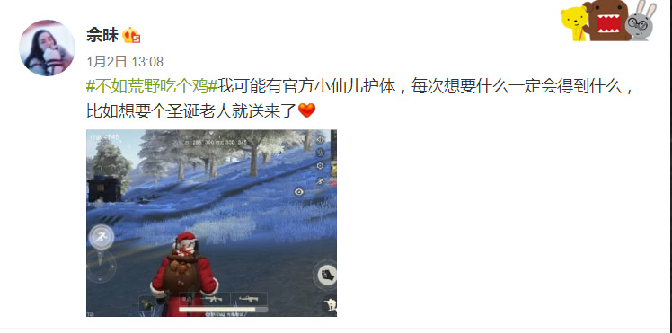 成功的UGC传播还需要游戏有“干货”,丰富的内容才能保证玩家不断产出新的二次创作。《荒野行动》的研发人员十分注重游戏的新鲜感保持,平均两三天就会有一次更新迭代,不断为游戏增加新玩法、补充大量热点元素。玩家在游戏中经常可以看到并参与游戏外的社交热点,例如补漏车、圣诞玩法、雪天、三轮摩托等等,而这些内容也会成为玩家钟爱的“晒点”。