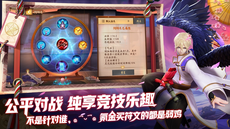 在游戏性方面,游戏中的式神拥有4个式神技能+2个通用灵咒,带来更多的技能组合和战术变化。游戏采用创新的地图设计和迷雾模式,让对战更富有可玩性和策略性。游戏无符文系统和战斗内数值付费点,采用完全自由免费搭配的”阴阳术“系统,让每局游戏都更有多样性,给玩家带来真正的公平竞技体验和游戏乐趣。