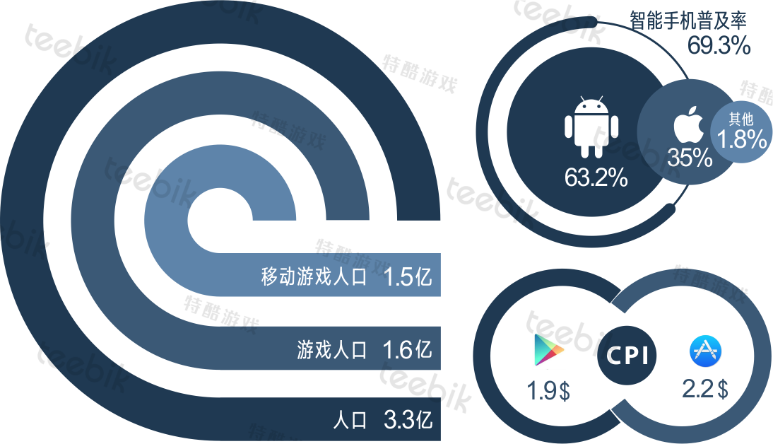 据Newzoo数据显示,2017年美国约3.3亿人口中,近半人数为游戏玩家。美国智能手机用户约2.26亿,普及率高达69.3%,其中移动游戏玩家有1.5亿,其中,Android平台是最大市场,占据约63%市场份额。