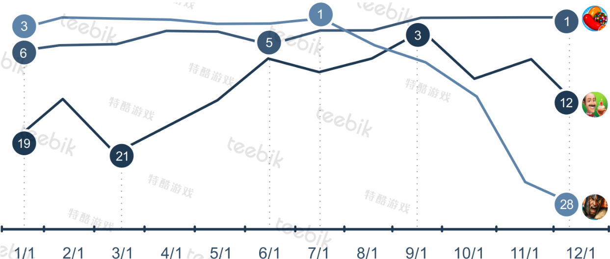 3.《战争游戏:火力时代》2017年上半年被Supercell双王牌游戏拉下神坛,下半年意外遭遇《糖果粉碎传奇》回马枪而离冠军宝座渐行渐远。