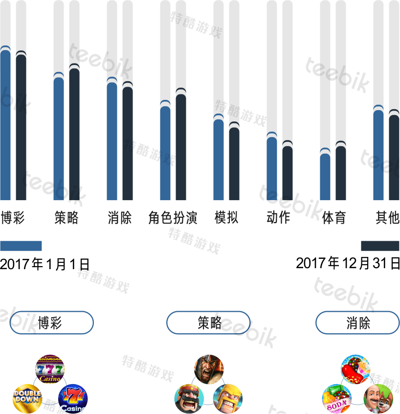 2017年美国畅销游戏主要类型有博彩、策略、消除等品类。