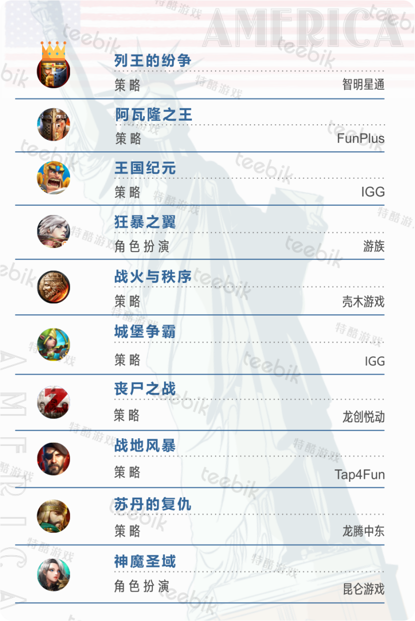 中国在美国市场占据超过10%的市场份额,主打策略和角色扮演游戏,活跃在美国的中国发行商以早期进入美国的智明星通为首, FunPlus,IGG,昆仑游戏,壳木游戏,龙创悦动,Tap4Fun等近年在美国市场也都有不俗表现;英国公司在美国市场主打消除、体育类游戏,上述有所提及,英国king公司的消除游戏占整个美国40%市场份额,旗下6款消除均上榜美国日畅销榜且排名都在TOP50内,成绩之优异另美国本土消除望尘莫及。