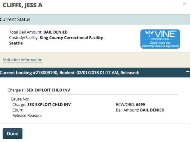 西雅图警方的逮捕记录显示,克里夫被拒绝保释