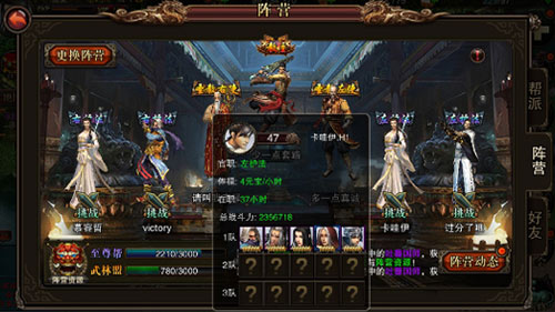 在阵营中,有不同的官职可供玩家竞争,官位越高获得的元宝也就越多。当官职晋升为帮主后,可自由分配金库铜钱,但每个阵营每天仅可分配一次。玩家可以从低到高选择不同职位的玩家进行挑战,获胜后即可接替该玩家原有的职位,但一旦接受了官职就无法主动辞职*且当玩家拥有官职时无法进行阵营的变更。挑战分为三个战队来进行,每个玩家将自己的豪侠搭配成三队人马(豪侠不可重复选择),在查看资料时只能够查看到对方1队的阵容,这意味着第一队的胜负是可以掌握在自己手中的,通过合理的阵容搭配和针对就能够有一定的胜算。