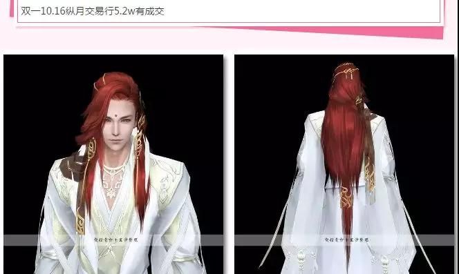 比如,《剑三》曾在2014年8月28日推出过一款限量1.6万个发售的五周年红发“赤影”,根据剑网3物价最新的交易显示,这款头发于2017年10月16日在交易行转手卖出,成交价达5.2万人民币,也成为了目前《剑三》最贵的外观。