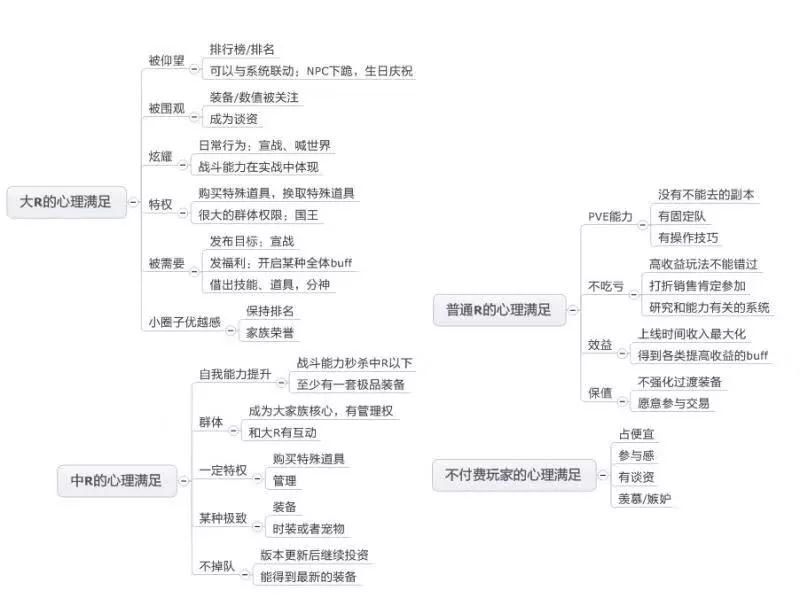 这是传统F2P游戏玩家的心理分析图,讽刺的是玩家的心理满足并不来源于公平,而是攀比产生的羡慕和占便宜。这与史玉柱八字分析“荣耀、目标、互动、惊喜”如出一辙。