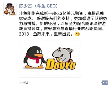 这已经是斗鱼第6次获得融资了,同时也是腾讯第3次投资斗鱼。2016年3月,斗鱼的B轮融资由腾讯领投,投资金额达到1亿美元,在这之中腾讯占去了4亿多元。而这只是腾讯对斗鱼直播业务能力认可的第一步。腾讯投资总监余海洋当时也曾表示,“斗鱼从游戏直播领域切入,在过去一年多时间发展迅速,获得了用户的认可,也有大量的非游戏内容在斗鱼直播平台涌现。作为投资方,我们很认可。”