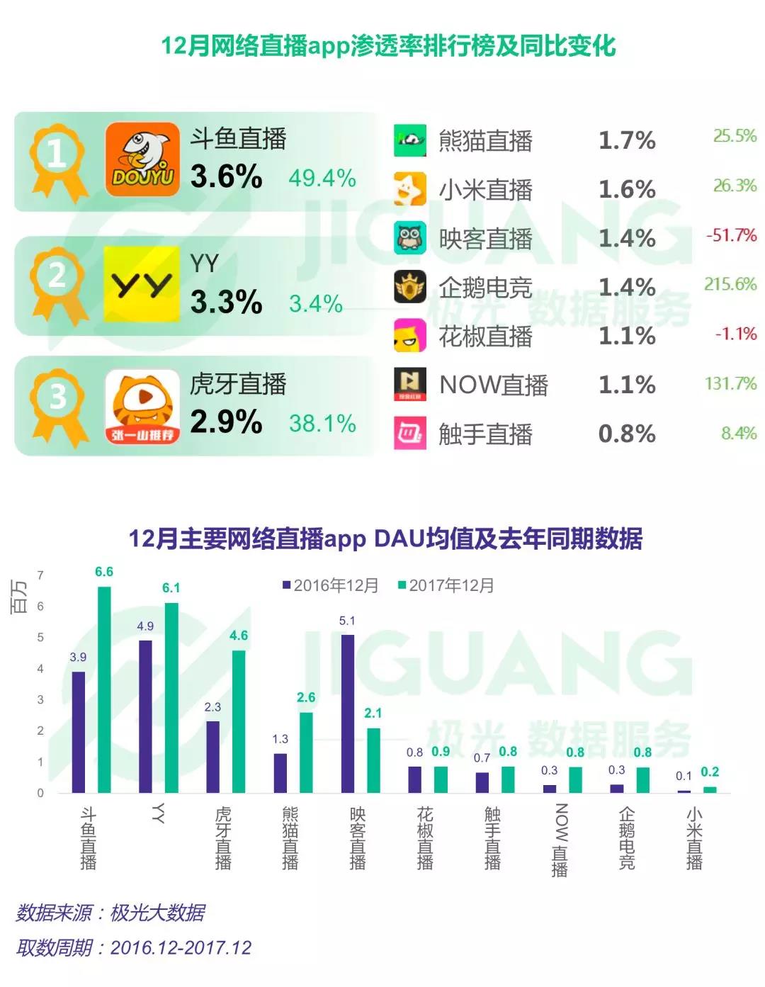 根据极光大数据发布的数据,去年12月移动端市场渗透率最高的三个直播平台分别是斗鱼直播、YY和虎牙直播,斗鱼直播的渗透率达到3.6%。另外,在DAU方面,斗鱼直播也占据第一位,去年12月斗鱼直播日活跃用户均值达到了660万左右,相比去年增长了不少,YY、虎牙直播、熊猫直播紧随其后。